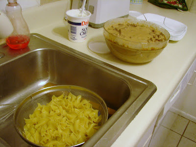 Put a large stockpot of water on the stove to boil and prepare one package of egg noodles as directed.